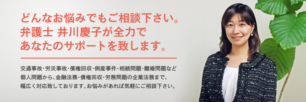当事務所では、企業法務に加え、交通事故・労災事故等の損害賠償請求・倒産事件をメインにしつつ、その他、相続問題・離婚問題等など、幅広く対応致しております。依頼者様のご意向を聞きながら、どのように進めていくのがベストな解決方法なのか考え、対応させて頂いております。問題が生じた場合、早めの対応が必須ですので、早めに気軽にご相談下さい。